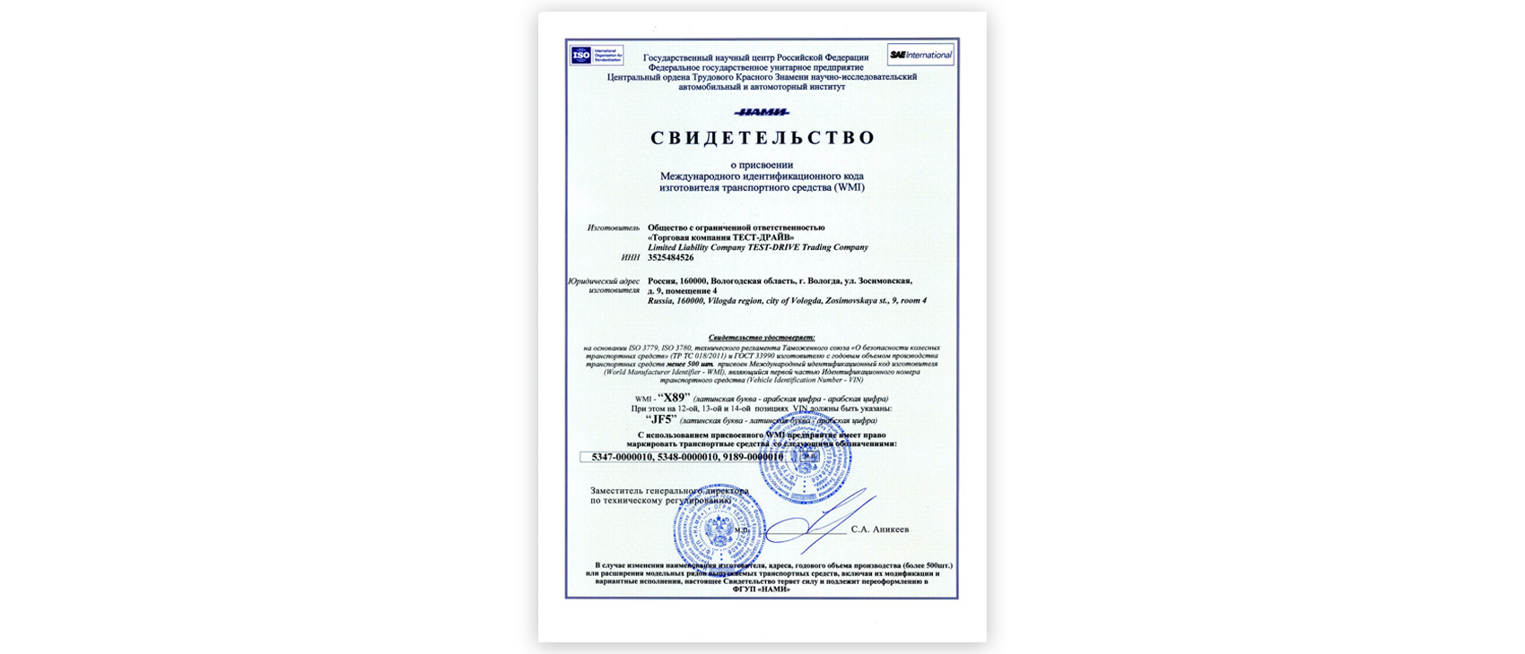 свидетельства о присвоении кода WMI